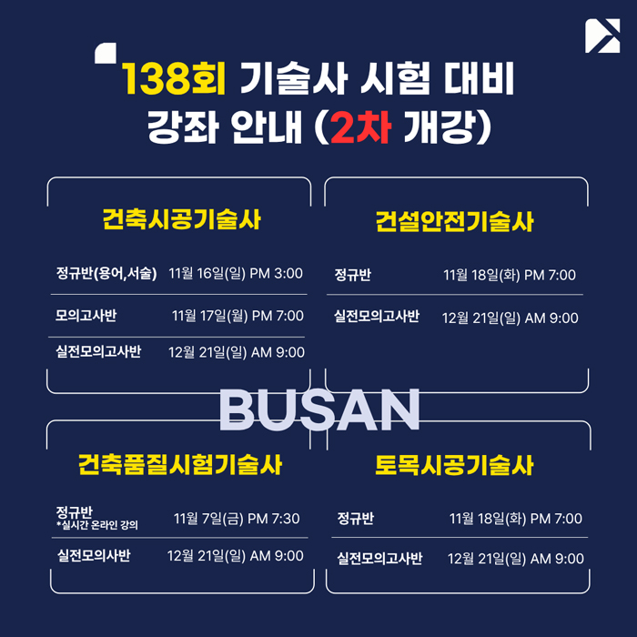 건축품질시험기술사는 정규반 11월 7일(금) PM 7시 반