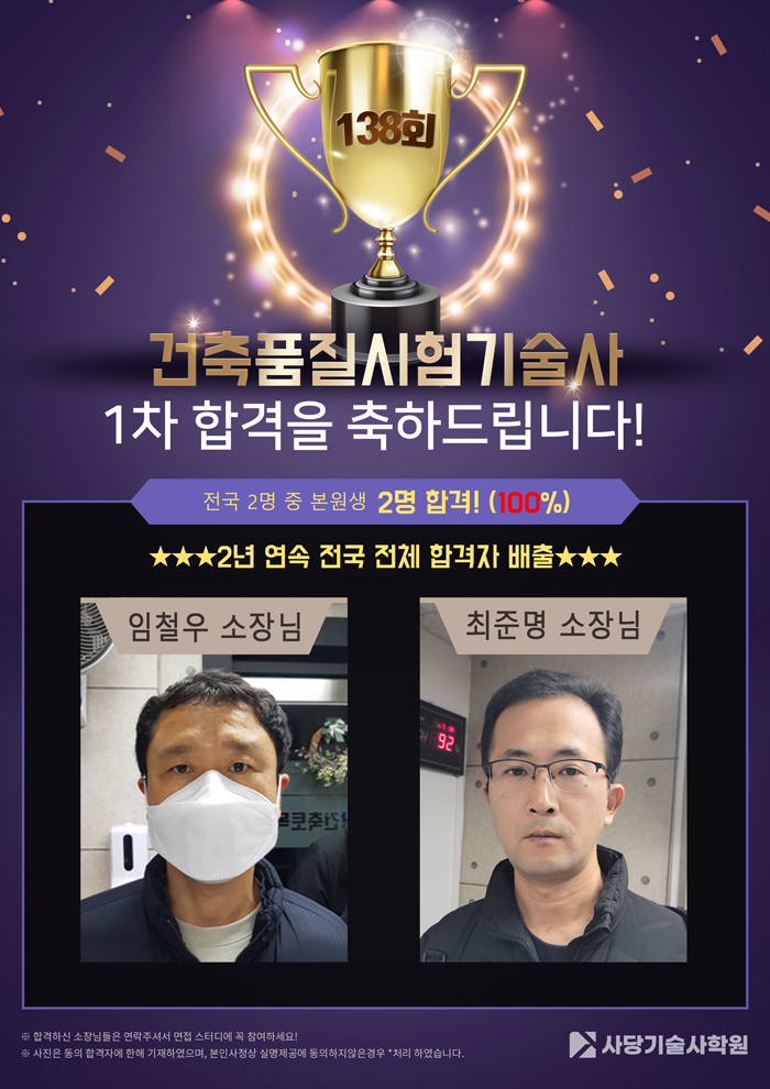138회 건축품질시험기술사 1차 합격자 명단(본원 2명 합격, 전국 100%)
